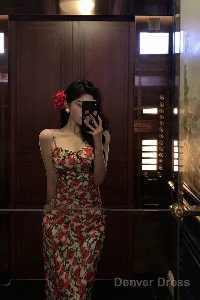 French Sheath Spaghetti Straps Floral Prom Dresses Birthday Outfits Evening Gown