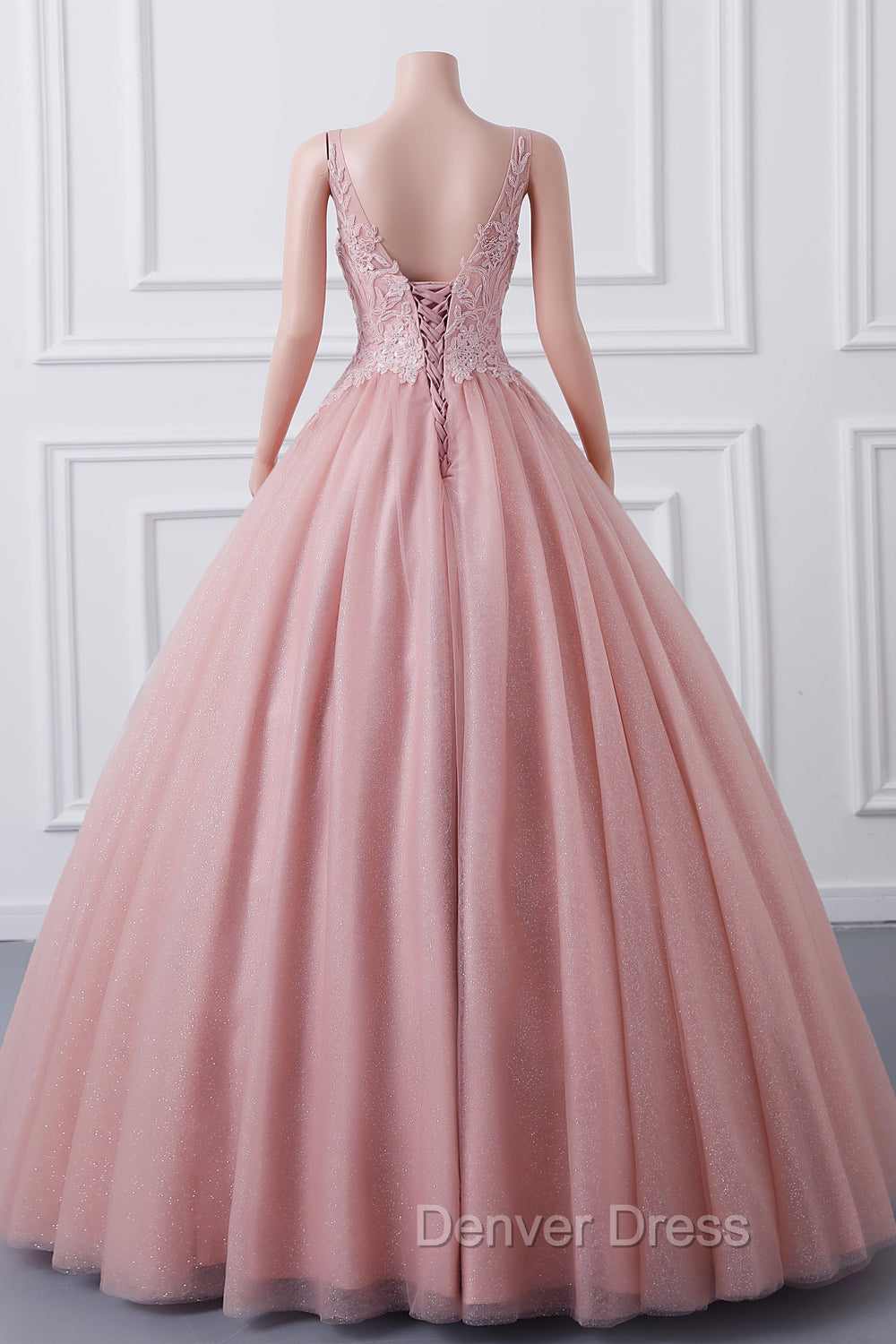 Girls Sequins V neck Dusty Rose Prom Dresses A-line Tulle Ball Gown Quinceanera Dresses Sweet 16 Party Dresses