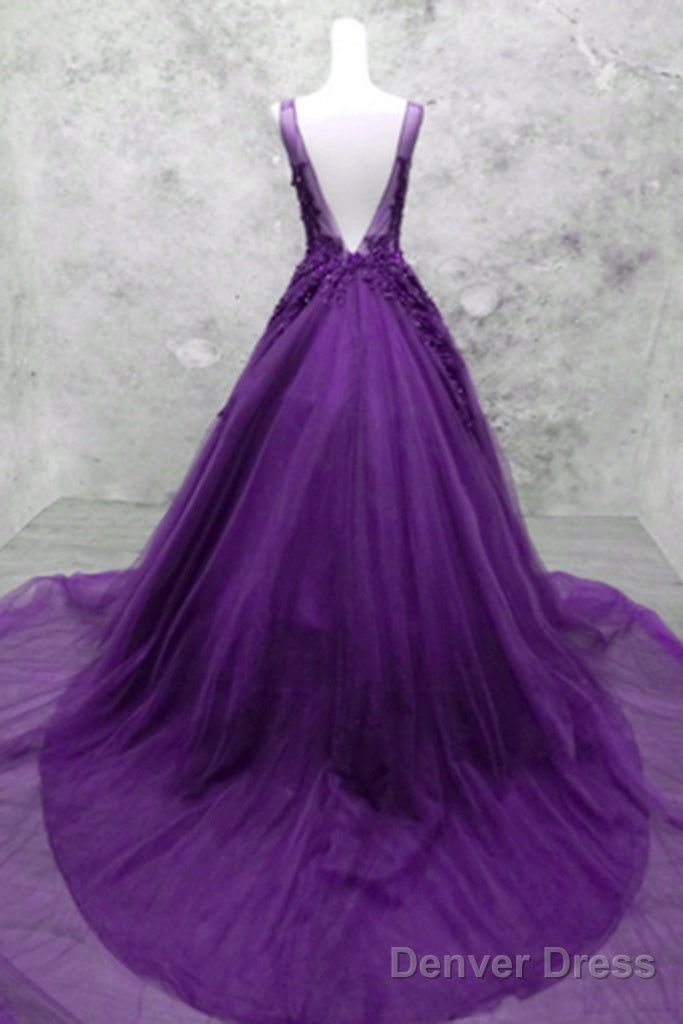 Glam Purple V-Neckline Tulle Beaded And Lace Formal Gown, Purple Long Prom Dresses
