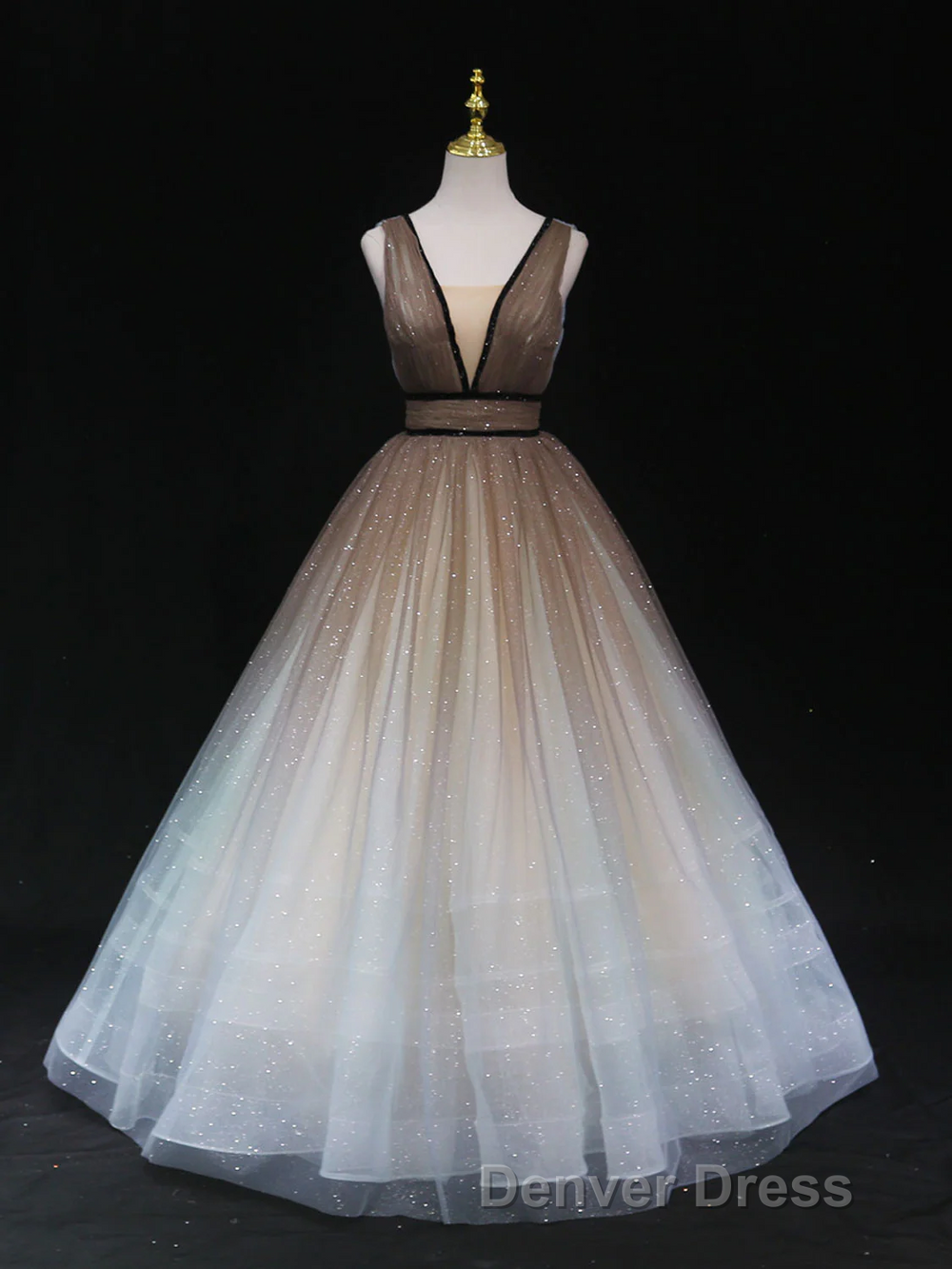 Glitter A-Line V Neck Tulle Long Prom Dresses Tulle Long Formal Party Dresses