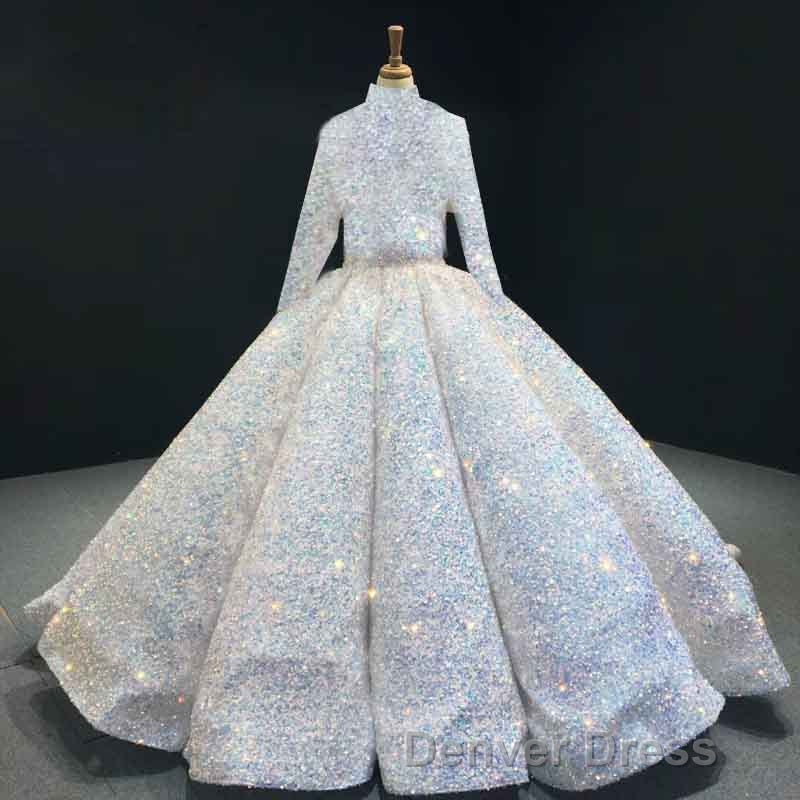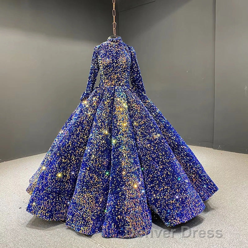 Glitter High Neck Open Back Lace Up Ball Gown Prom Dresses