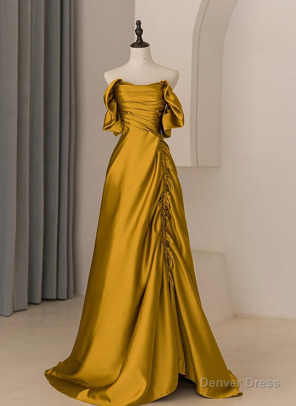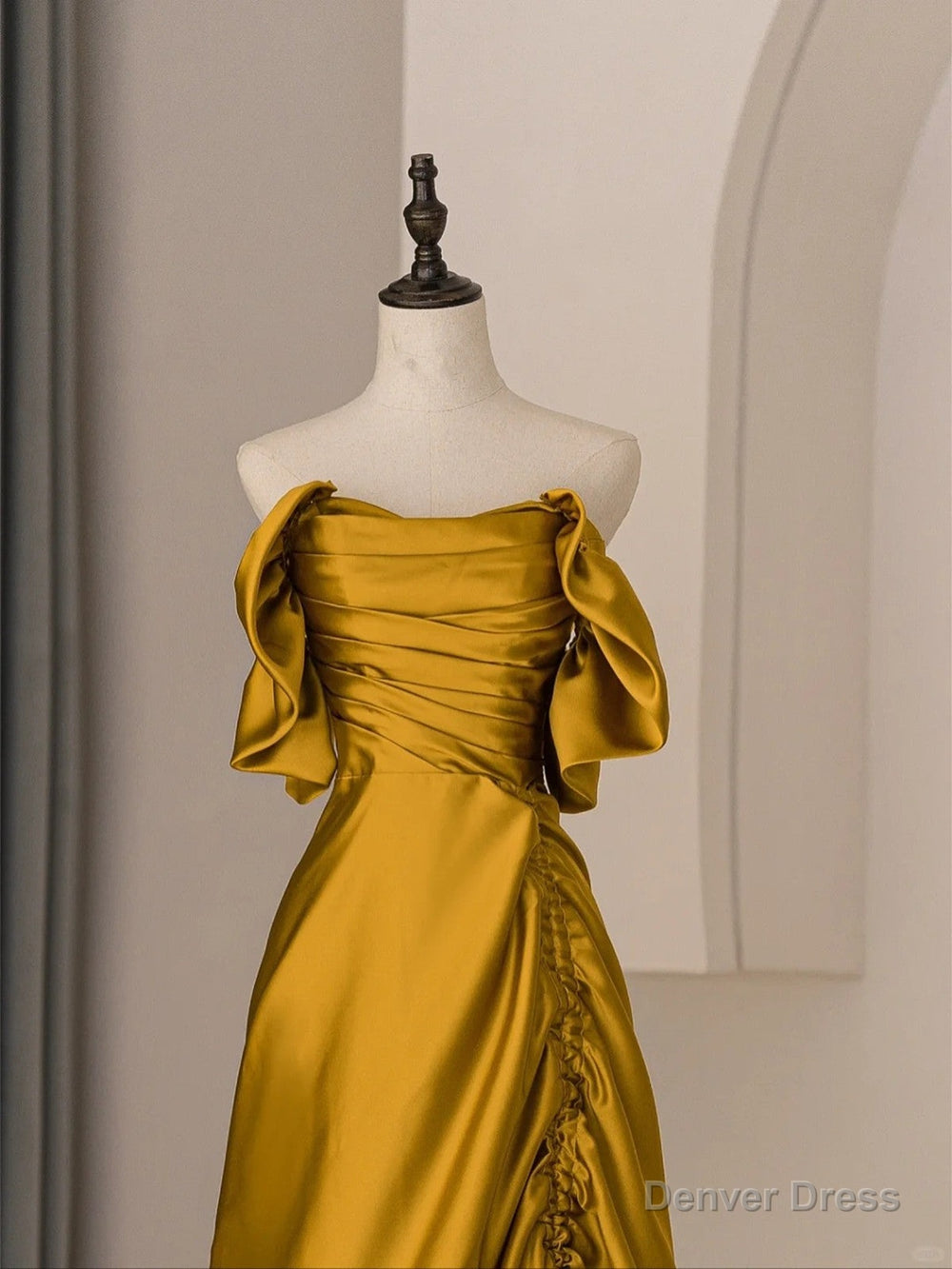 Gold Satin Off Shoulder Long Evening Dress, Gold Satin Prom Dress
