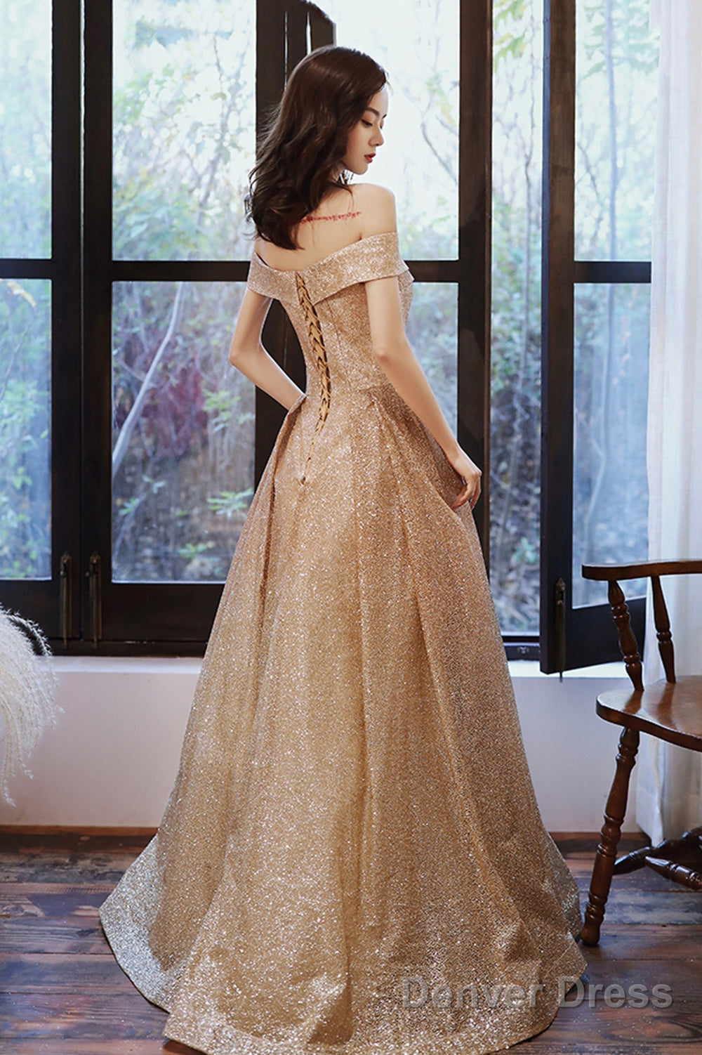 Gold Sequins Off The Shoulder Prom Dress, Shiny A-Line Evening Party Dress