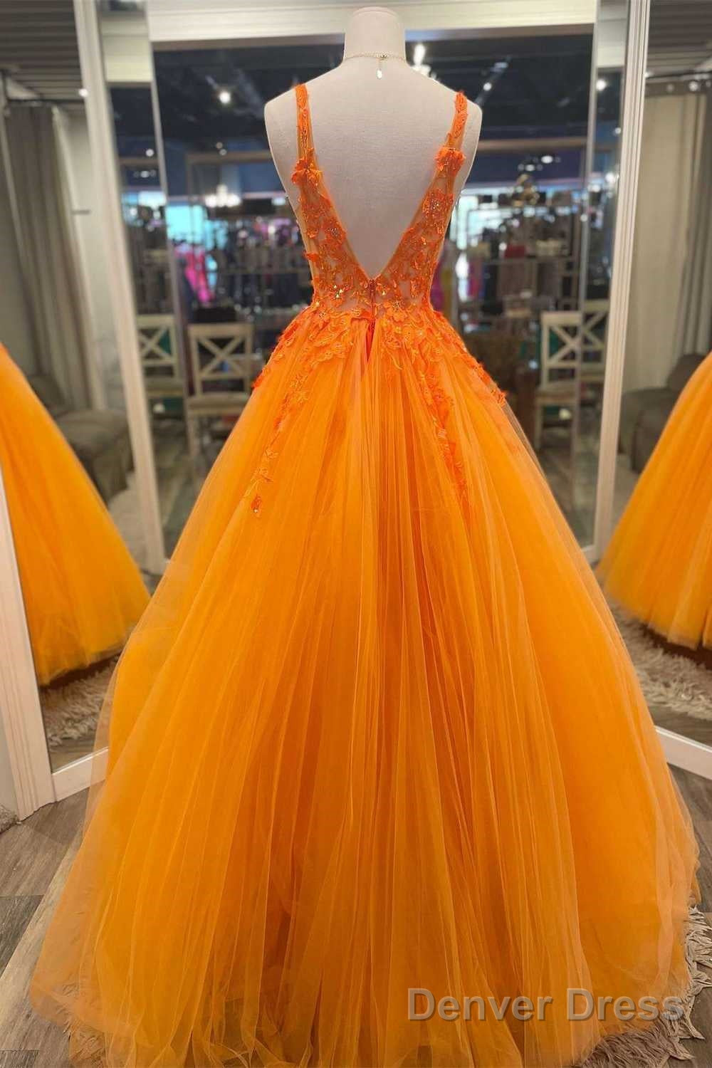 Gorgeous Orange V-Neck Floral Tulle Long Prom Dress