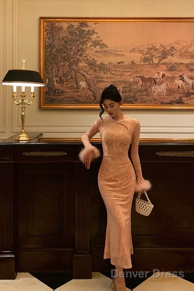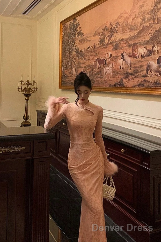 Gorgeous Sheath High Neckline Long Sleeves Pink Date Night Dress Long Prom Dresses Birthday Outfits
