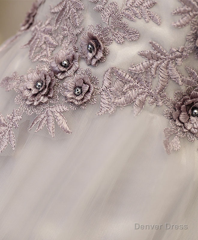 Gray A Line Off Shoulder Tea Length Prom Dress, Lace Homecoming Dress