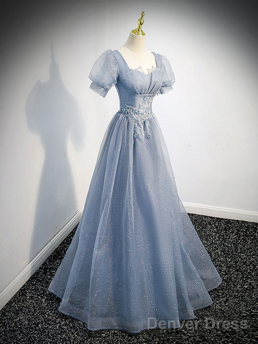 Gray Blue Tulle Sequin Long Prom Dress, Gray Blue Evening Dress