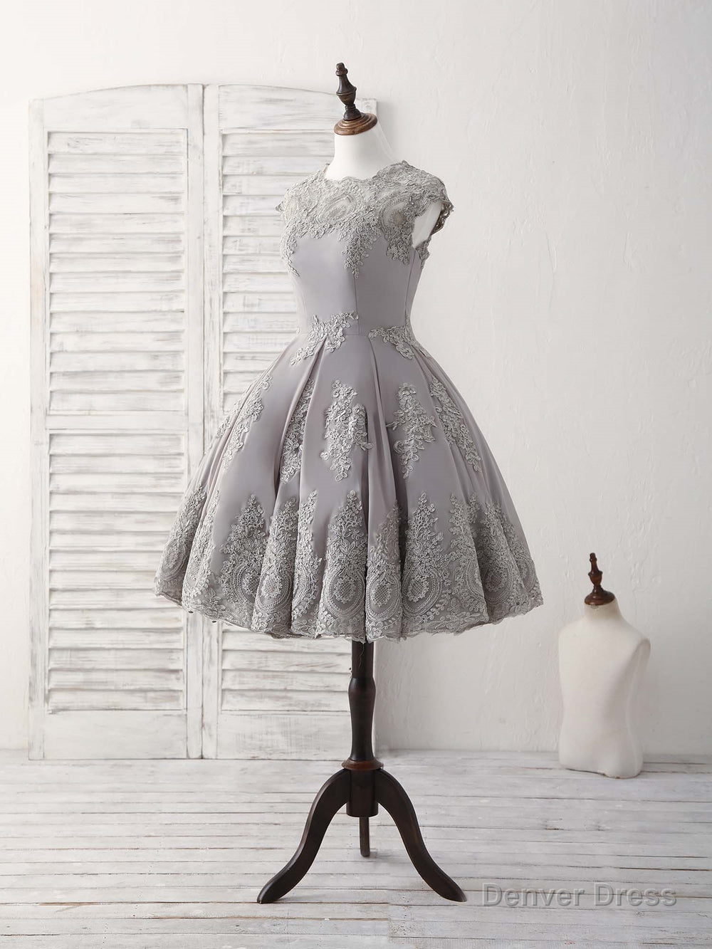 Gray Round Neck Lace Short Prom Dress Gray Bridesmaid Dress
