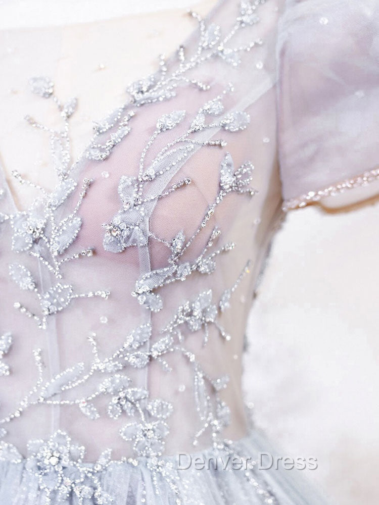 Gray Round Neck Tulle Lace Long Prom Dresses, Gray Tulle Evening Dresses