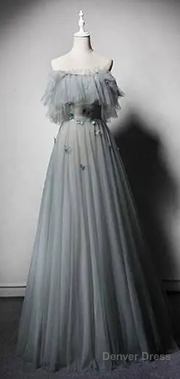 Gray Tulle A-Line Off Shoulder Prom Dress,