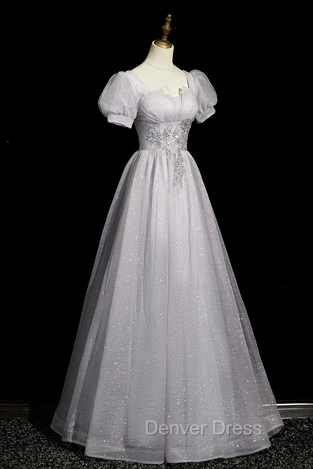 Gray Tulle Beaded Long Prom Dresses, A-Line Short Sleeve Evening Party Dresses