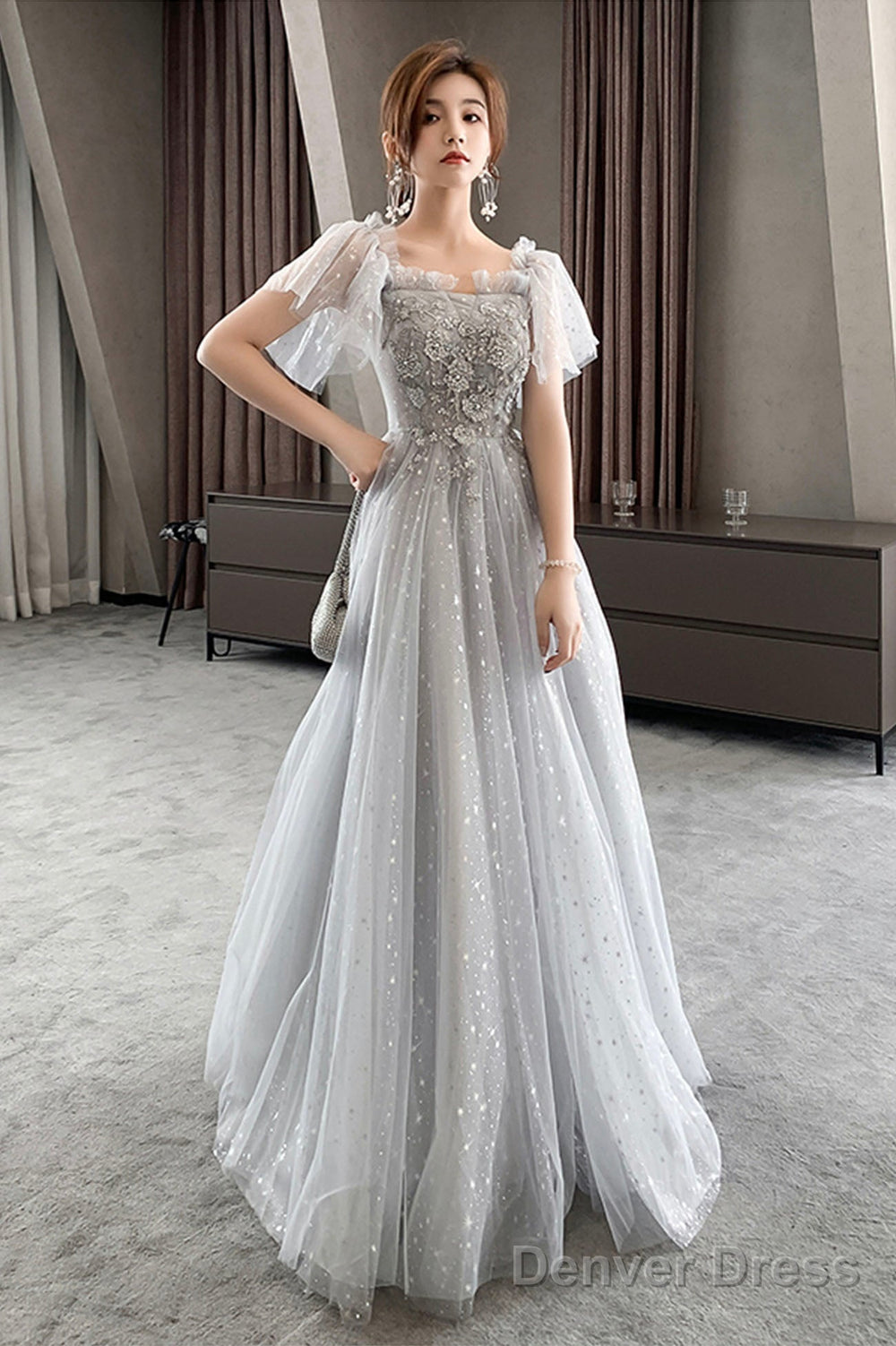Gray Tulle Lace Long Prom Dresses, A-Line Evening Dresses