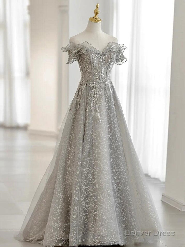 Gray Tulle Sequin Lace Off Shoulder Long Prom Dress, Gray Evening Dress