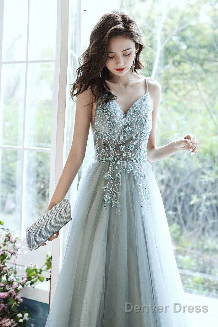 Gray V Neck Tulle Beads Long Prom Dress Beads Tulle Evening Dress