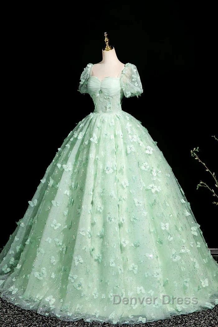 Green A-Line Tulle Beaded Sequin Long Prom Dresses, Beautiful 3D Butterfly Evening Dresses