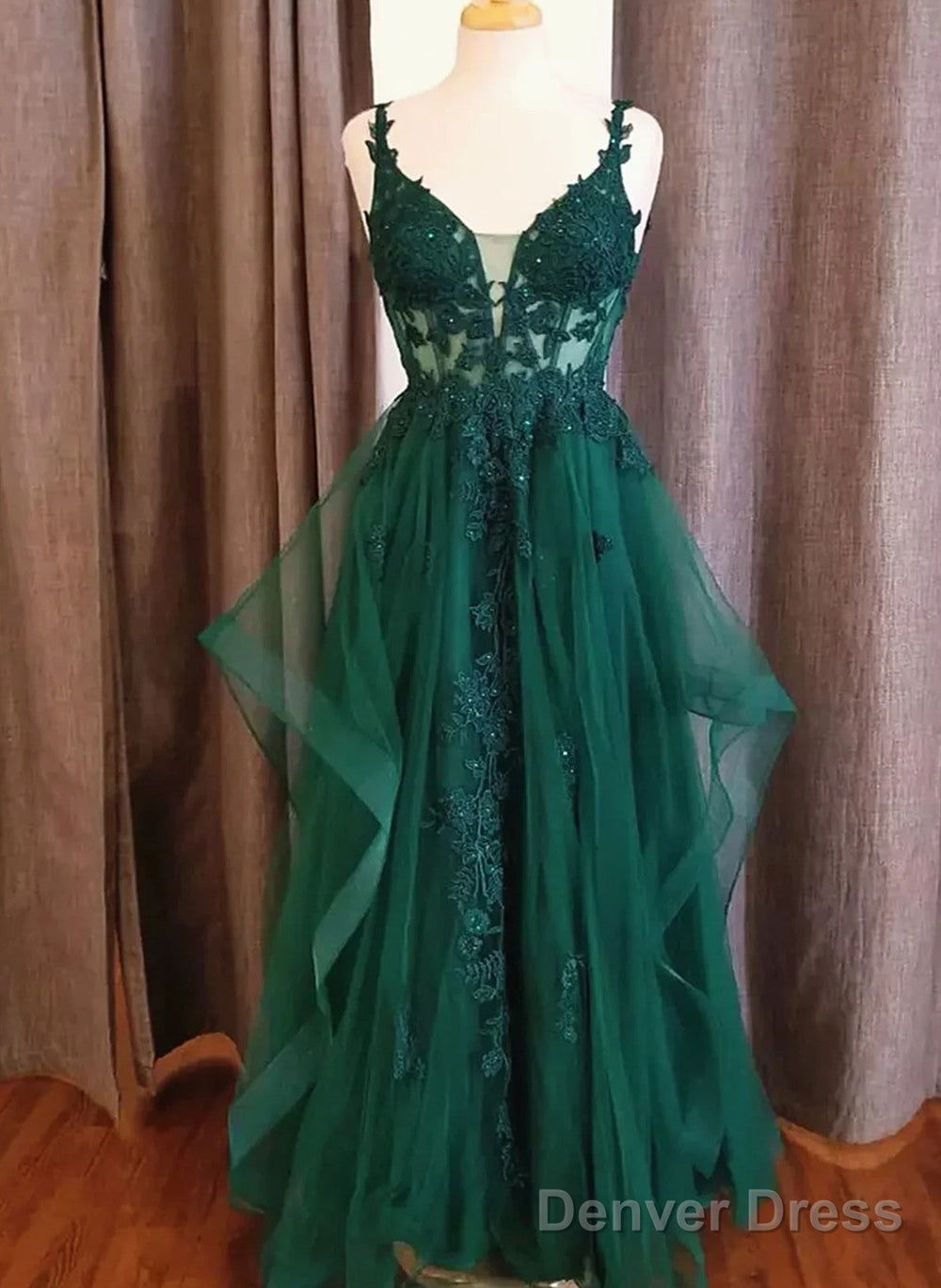 Green A-Line V-Neckline Tulle With Lace Prom Dress, Green Tulle Evening Dress