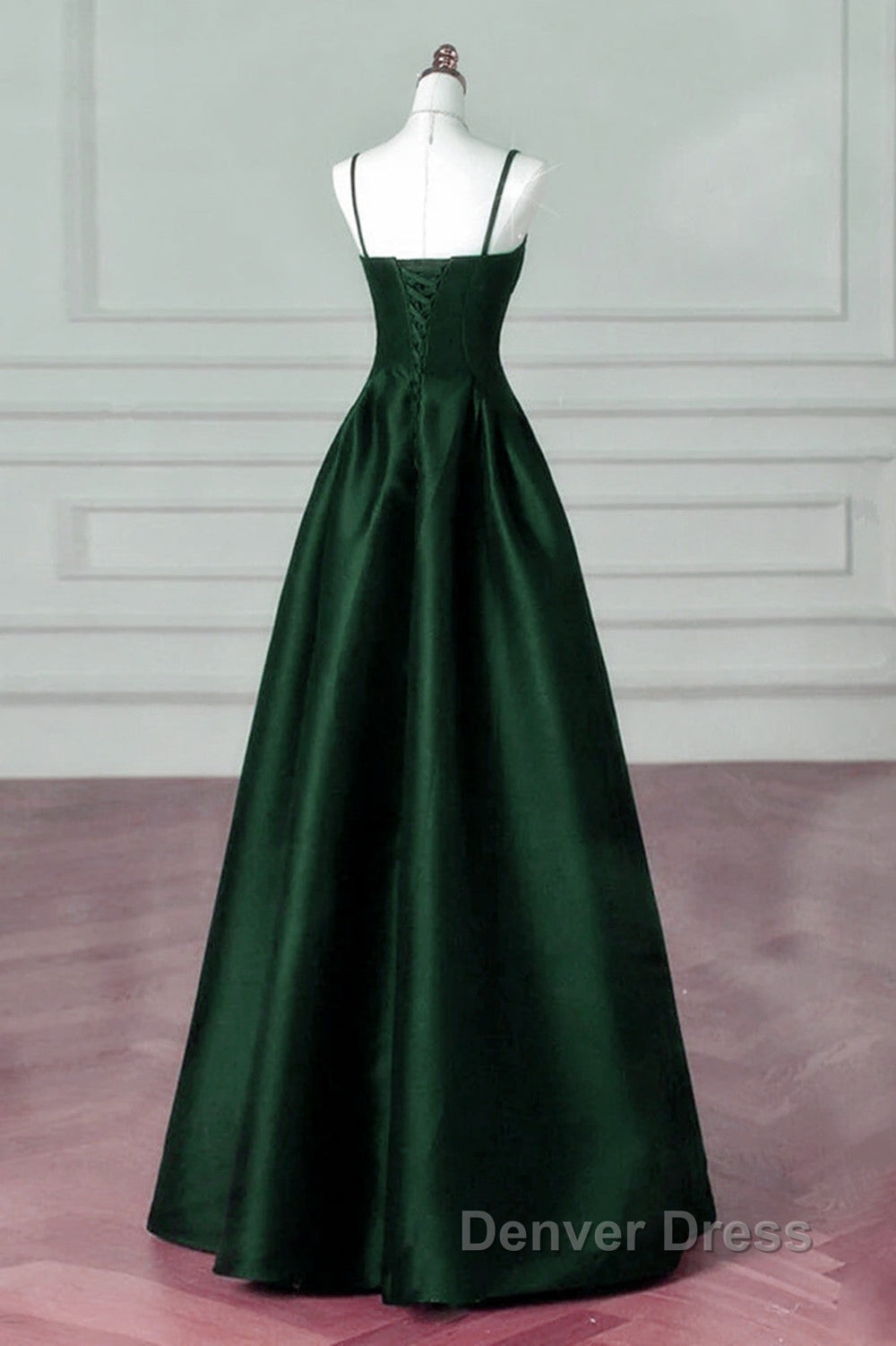 Green Satin Simple A-Line Floor Length Party Dresses, Green Satin Straps Prom Dresses