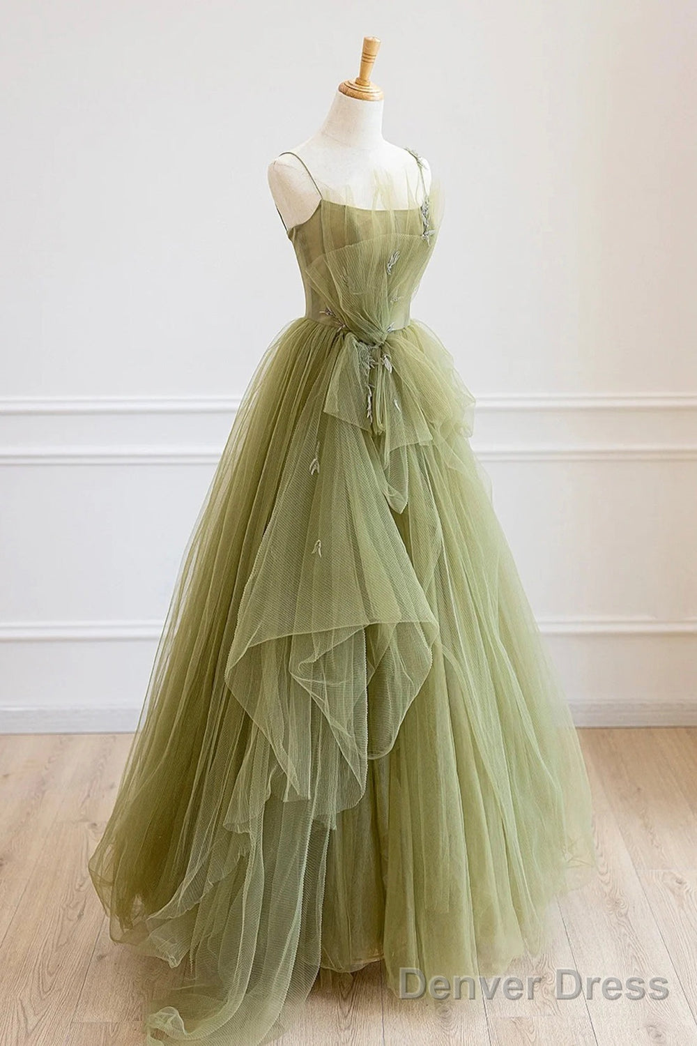 Green Tulle Long A-Line Prom Dress, Beautiful Spaghetti Strap Evening Dress