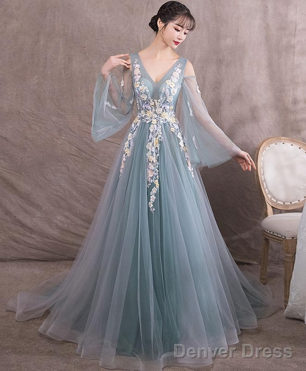 Green V Neck Tulle Lace Long Prom Dress Green Evening Dress