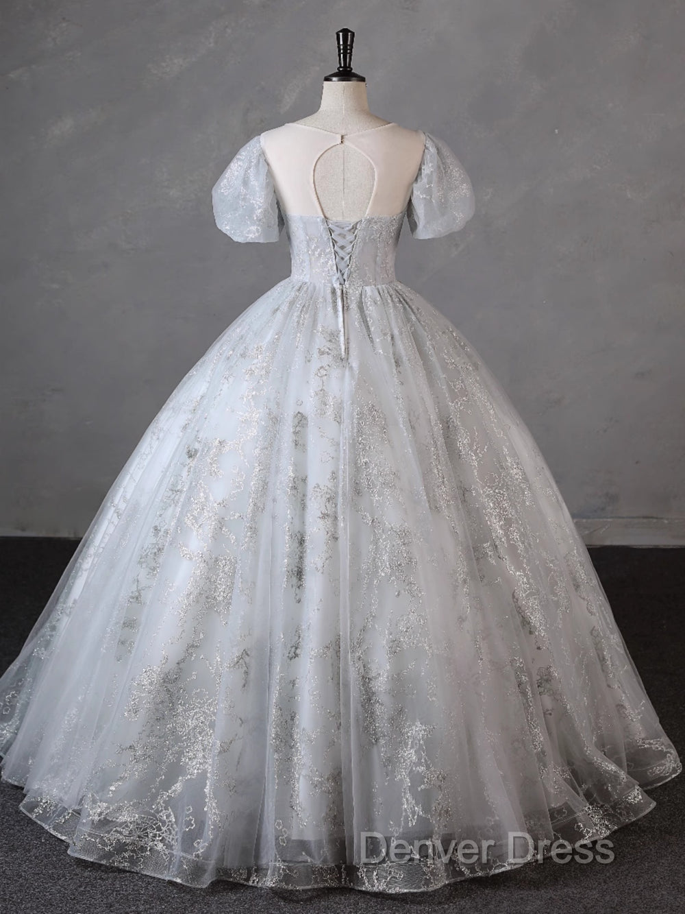 Grey Short Sleeves Tulle Ball Gown Prom Dresses, Grey Ball Gown Sweet 16 Dresses