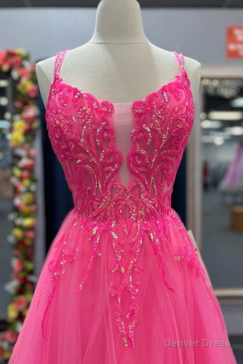 Hot Pink Tulle Appliques Lace-Up A-Line Long Prom Dress