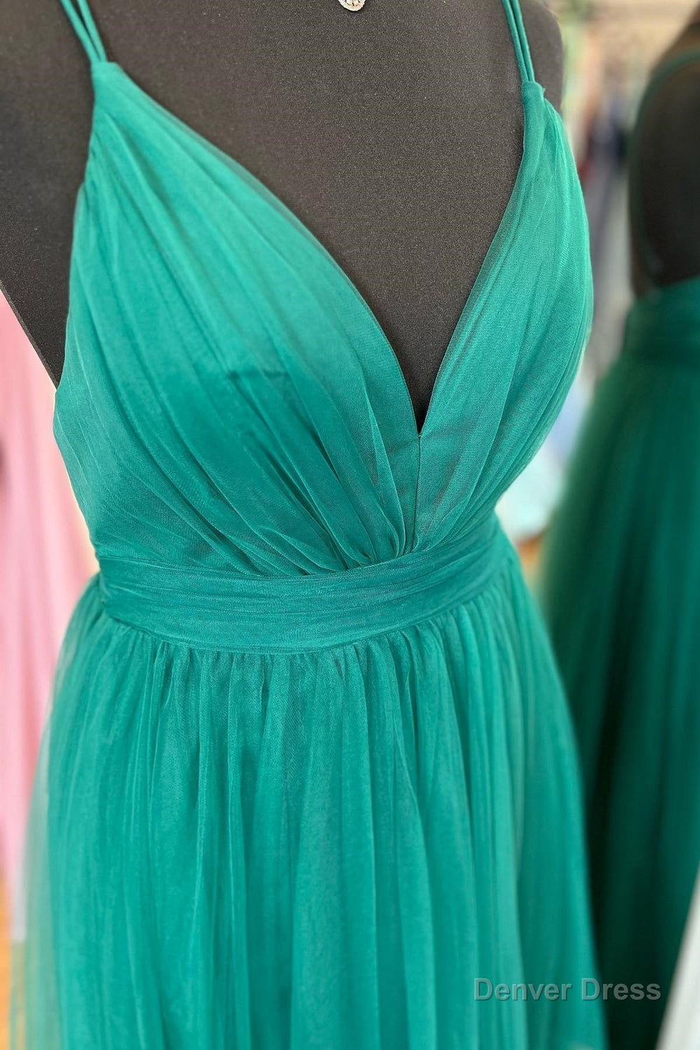 Hunter Green A-line Plunging V Neck Double Straps Pleated Long Prom Dress