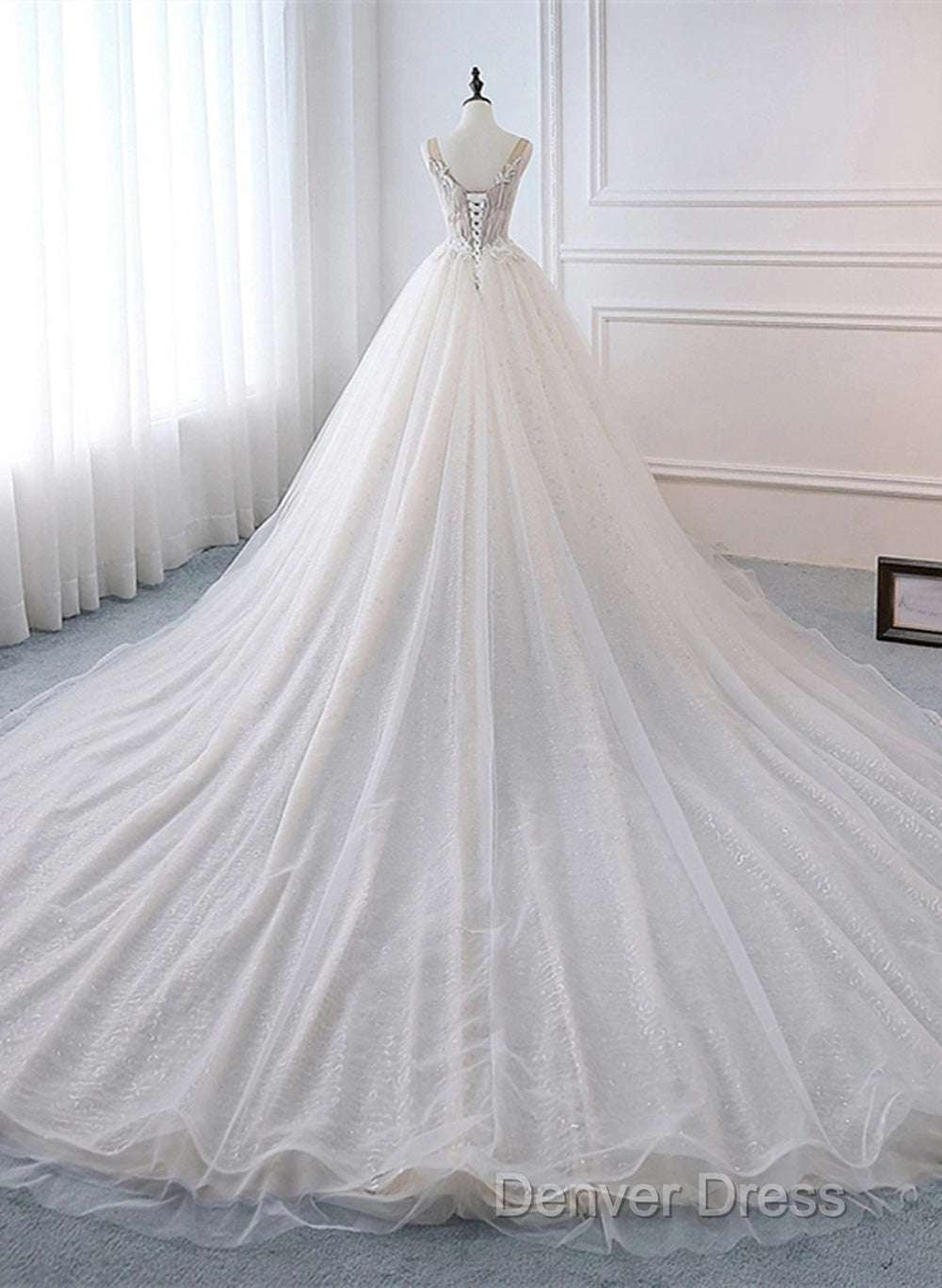 Ivory Tulle With Lace Long Wedding Party Dresses With Sweep Train, Ivory Formal Dresses