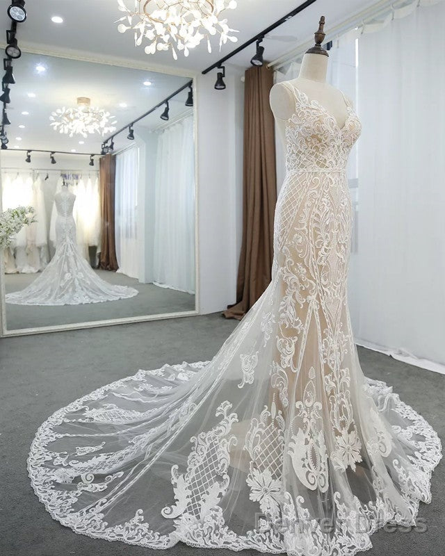 Lace V Neck Mermaid Wedding Dresses