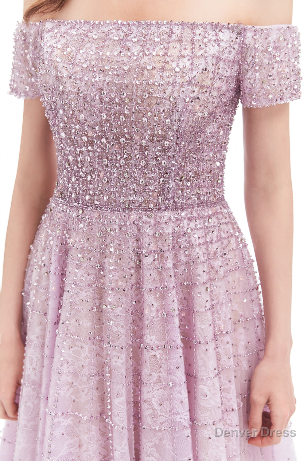 Lavender Lace Off the Shoulder Beaded Sequins Sweep-Train A-Line Prom Dresses