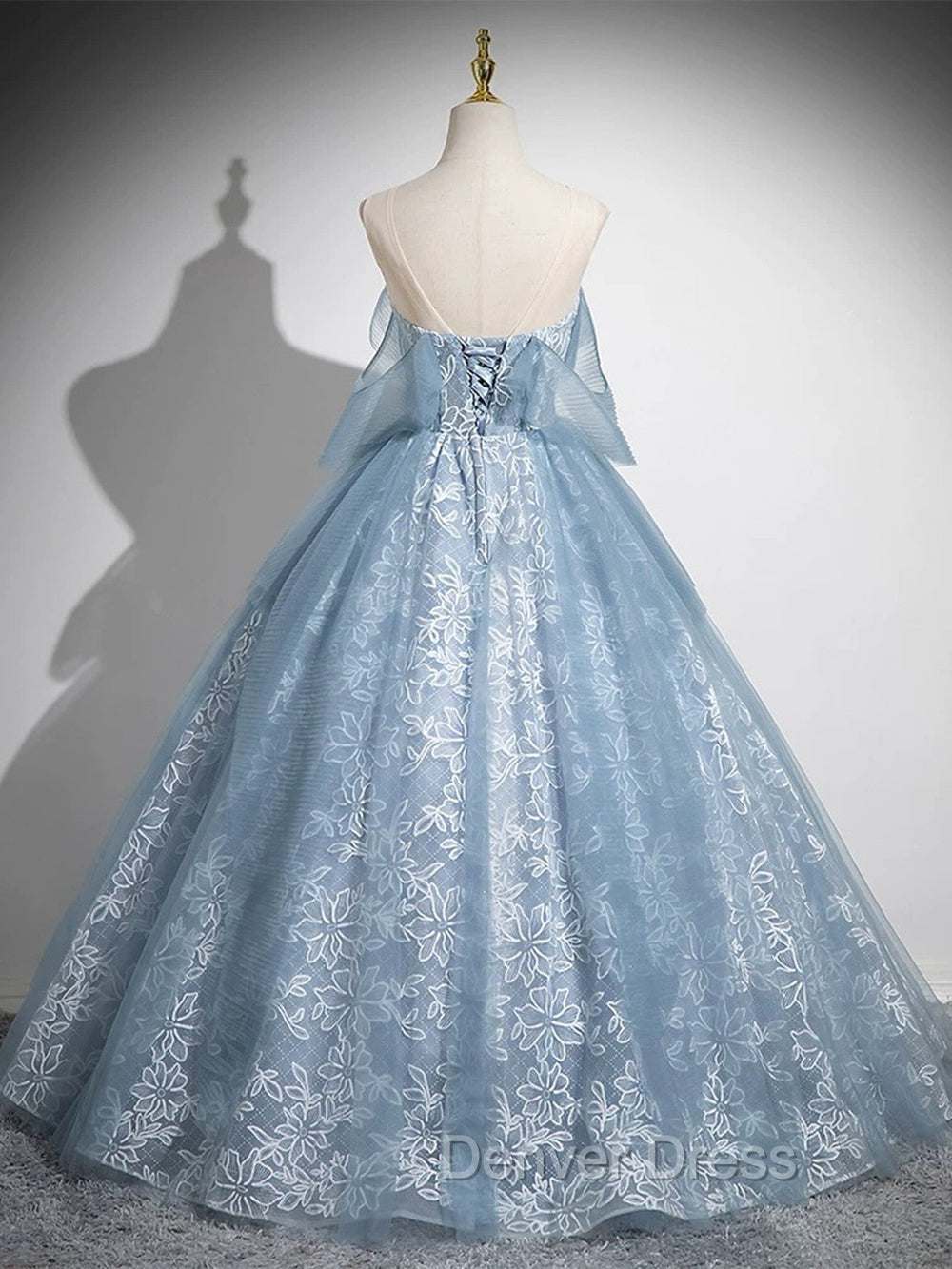 Light Blue A-Line Lace And Tulle Long Party Dresses, Blue Round Neckline Prom Dresses