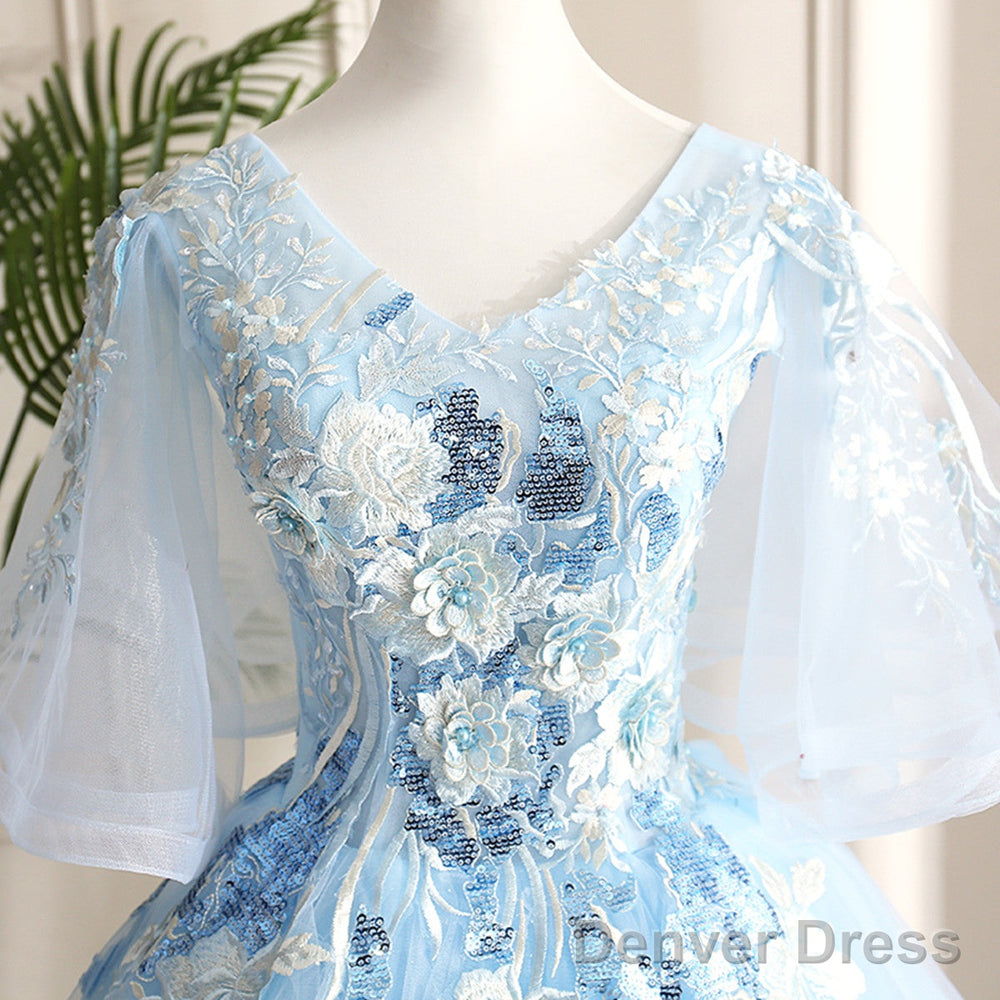 Light Blue Ball Gown V-Neckline Puffy Sleeves Party Dress, Light Blue Prom Dress