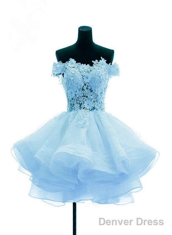 Light Blue Organza With Flower And Lace Short Party Dress, Blue Homecoming Dress