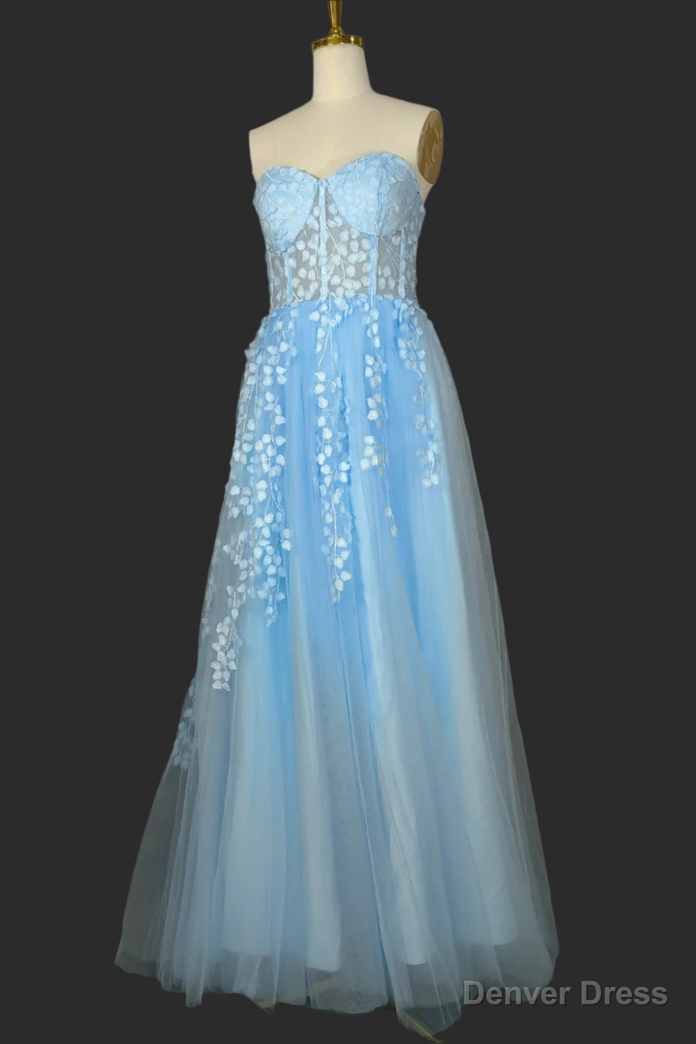 Light Blue Sweetheart Tulle Lace Prom Dresses Long Evening Party Dresses