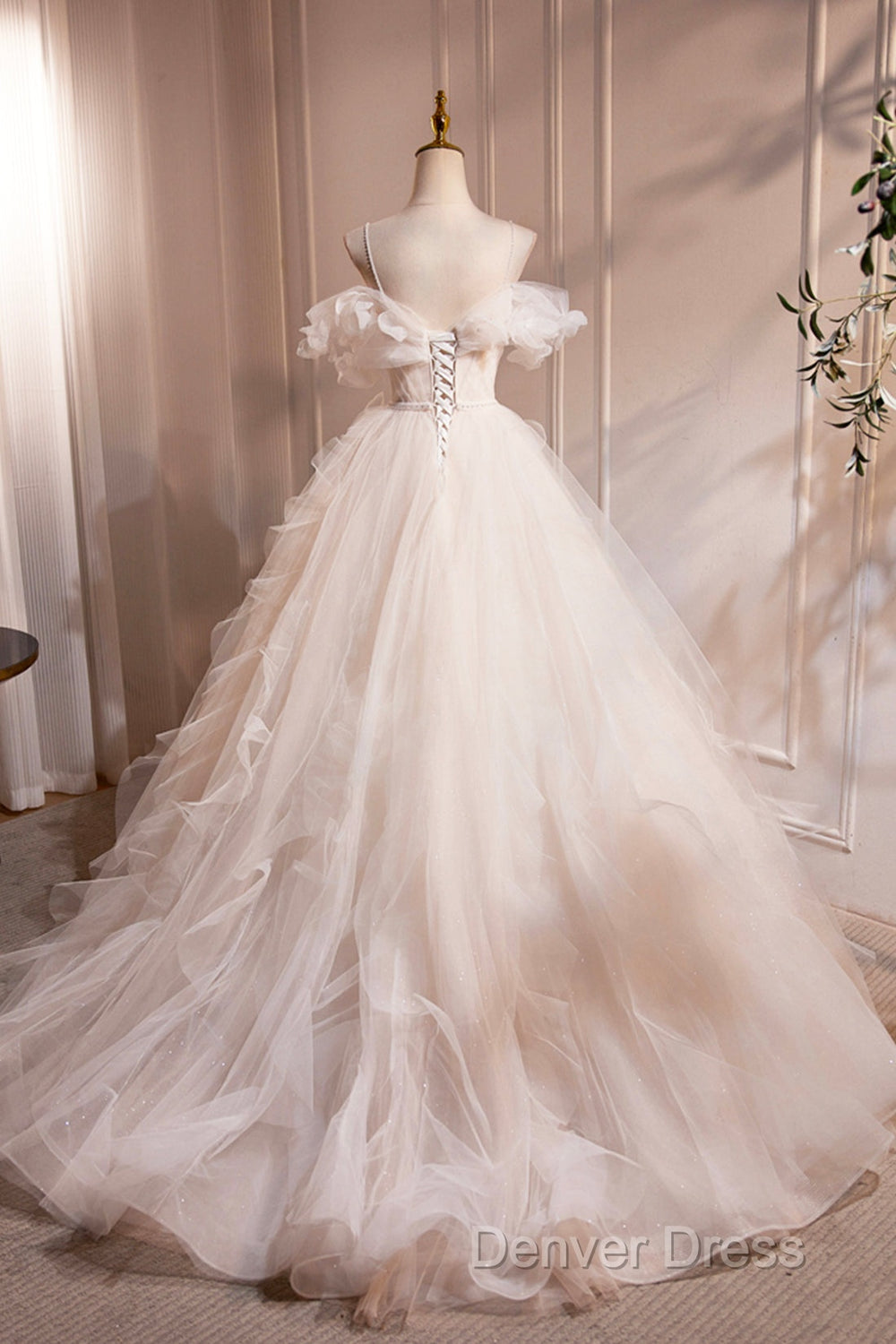 Light Champagne Spaghetti Strap Tulle Long Prom Dresses, Beautiful A-Line Formal Evening Dresses
