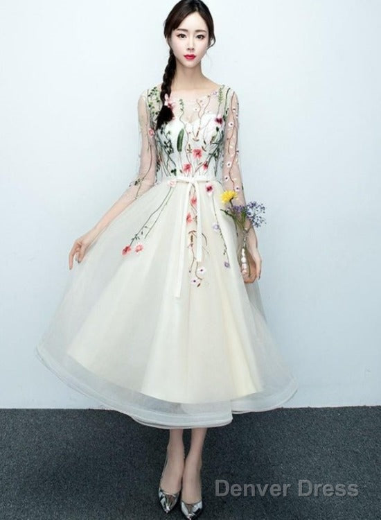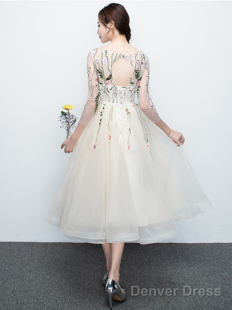 Light Champagne Tea Length Floral Lace Formal Dress Bridesmaid Dress, Cute Short Party Dresses