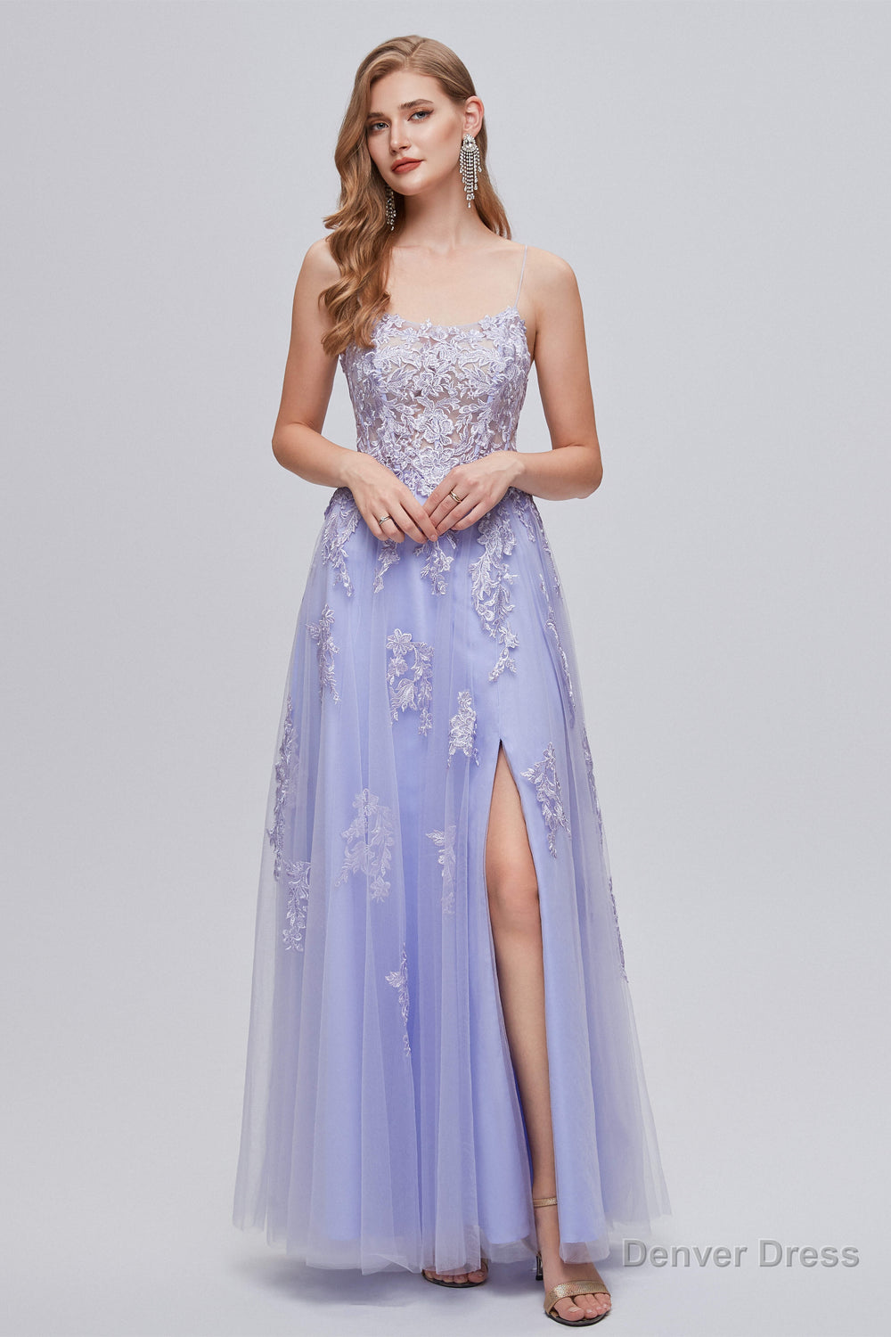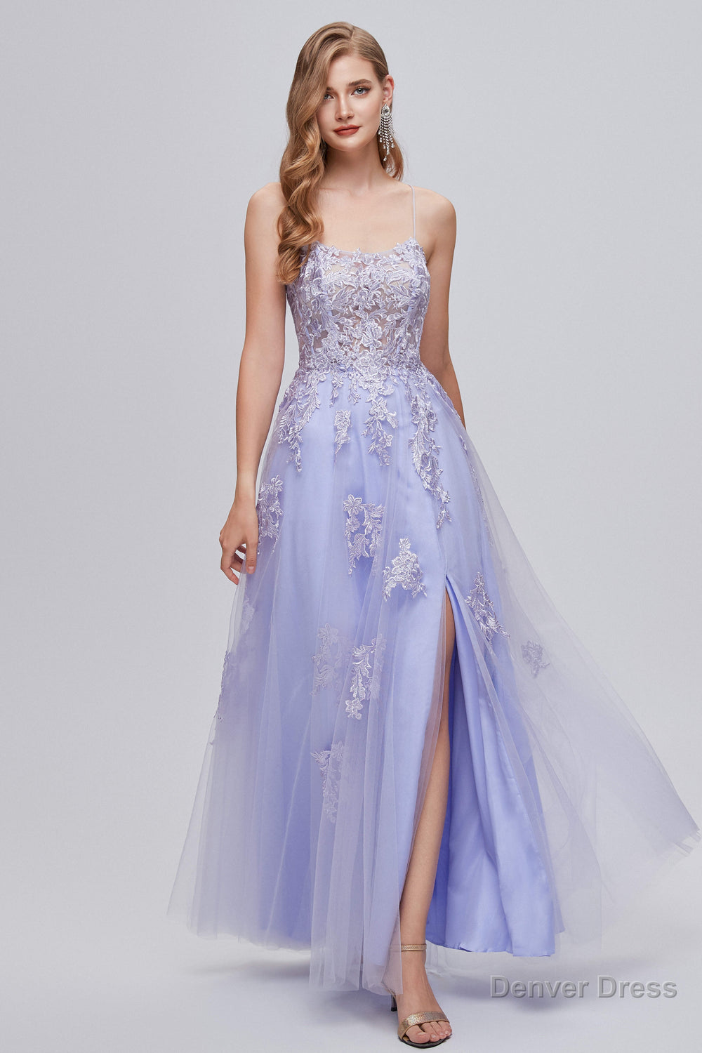 Lilac Appliques Lace-Up A-Line Long Prom Dresses with Slit