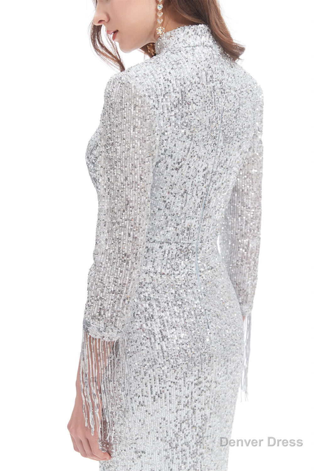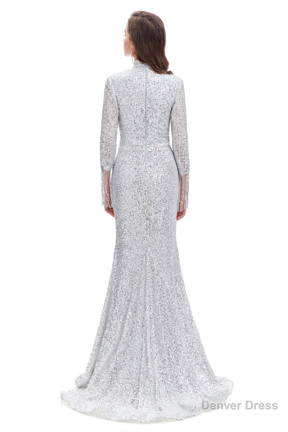 Long Sleeve Mermaid Prom Dresses Silver Sequins Trumpet