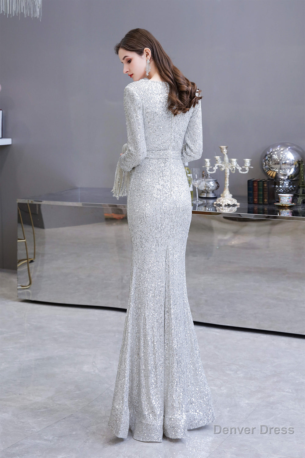 Long Sleeve V Neck Floor Length Crystal Beaded Sequins Mermaid Prom Dresses