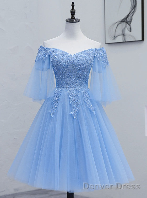 Lovely Light Blue With Lace Off Shoulder Short Prom Dress, Blue Homecoming Dresses