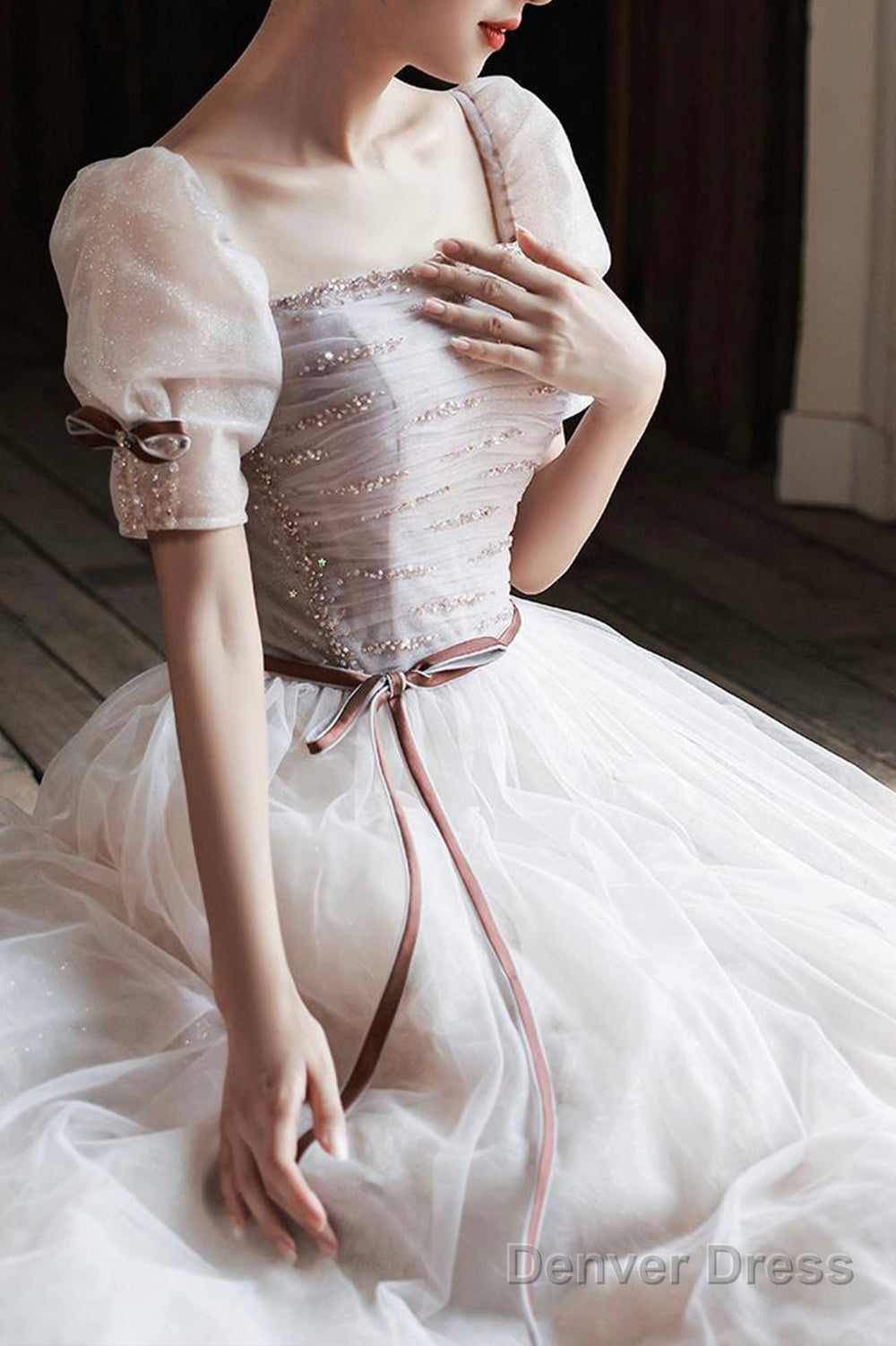 Lovely Tulle Sequins Long Prom Dress, A-Line Short Sleeve Evening Dress