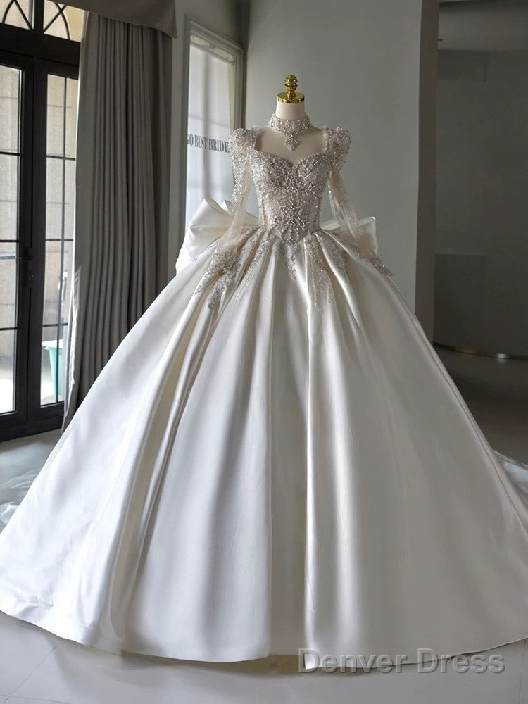 Luxury Ball Gown Sweetheart Neckline Long Sleeves Sequin White Wedding Dresses Brides Dress