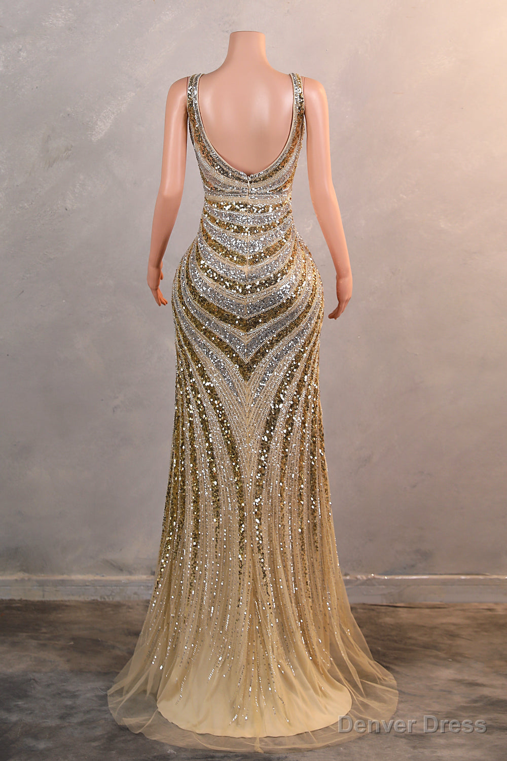 Mermaid Deep V Neck Golden Long Prom Dress with Silt