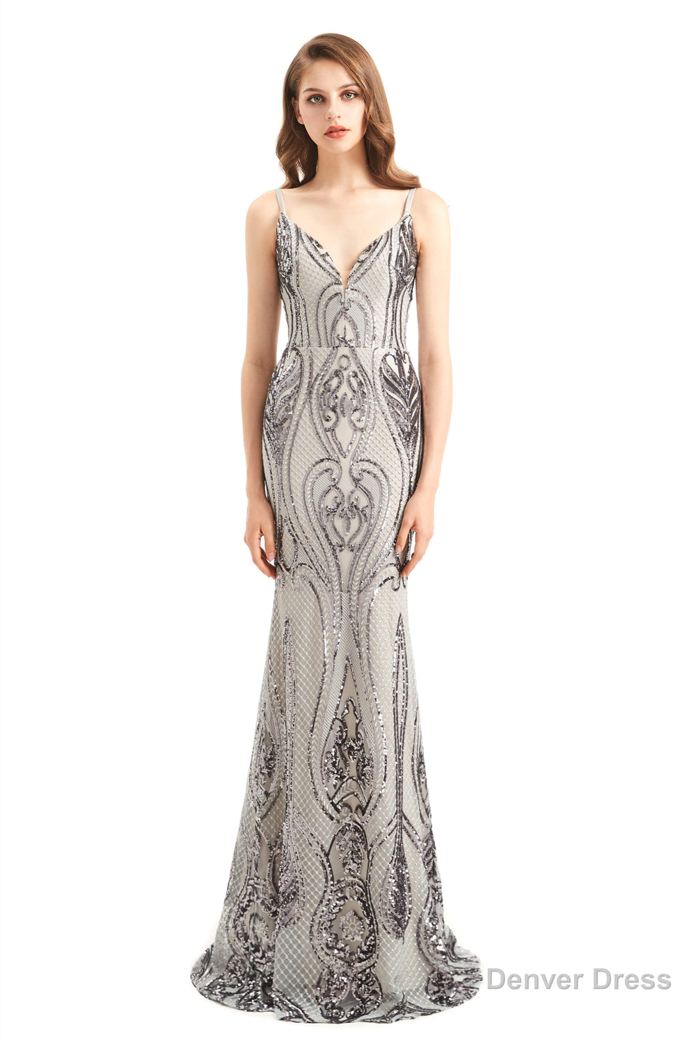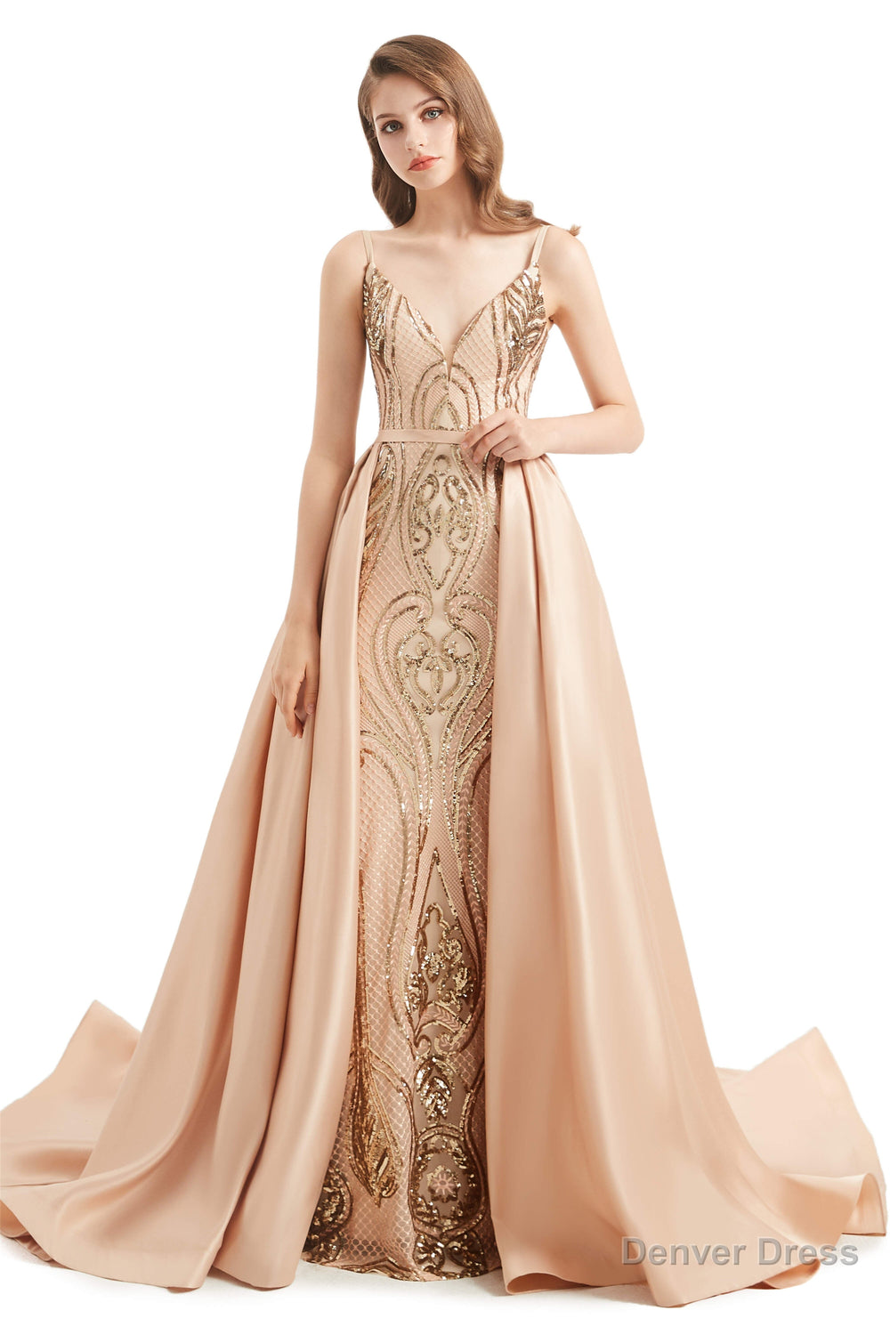 Mermaid Sequins Spaghetti Straps Prom Dresses With Detachable Train