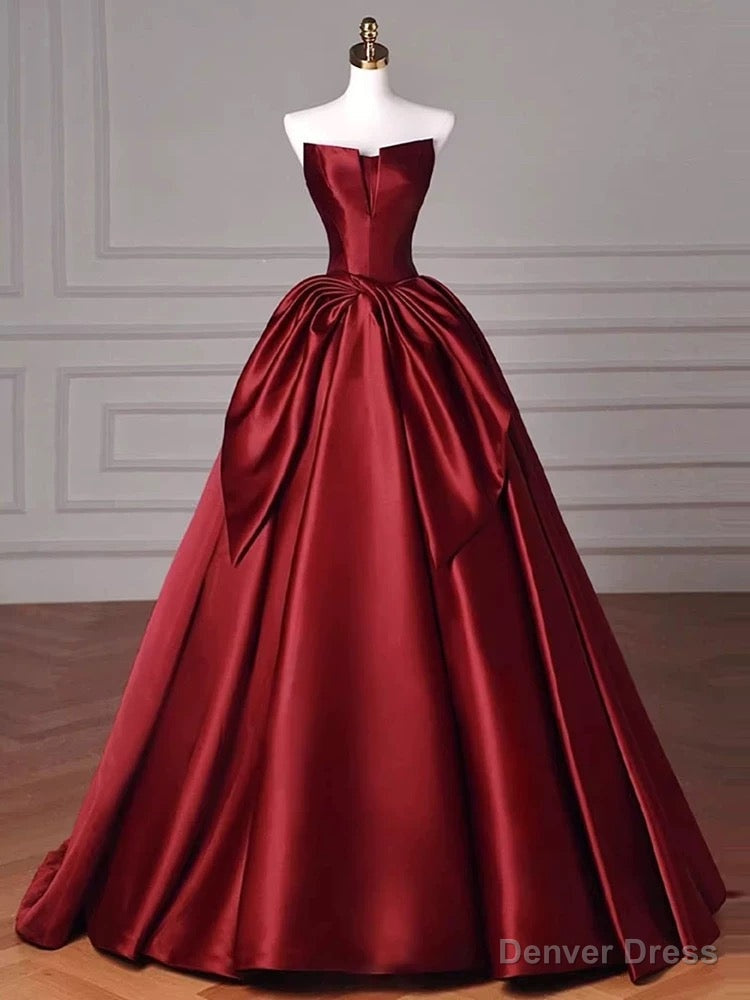 Modest Ball Gown Strapless Burgundy Satin Floor Length Evening Dress Prom Dresses