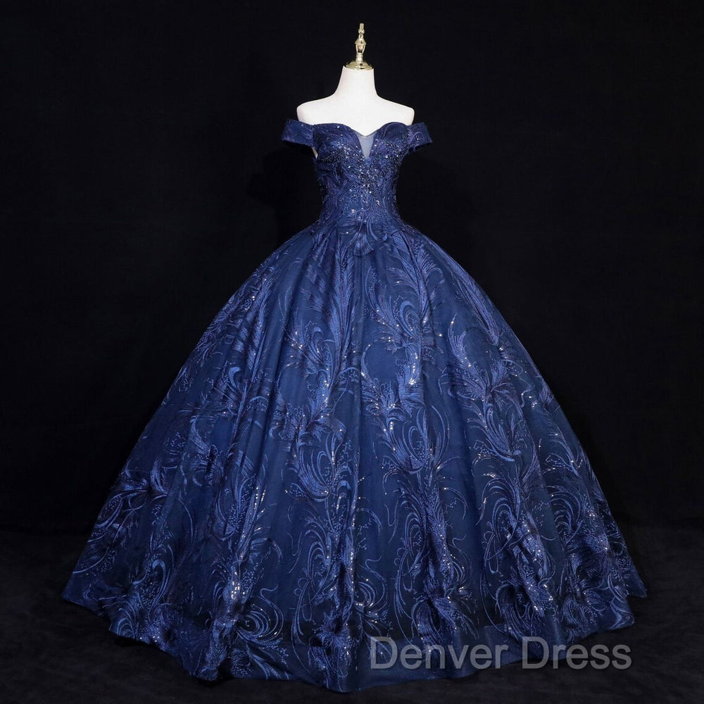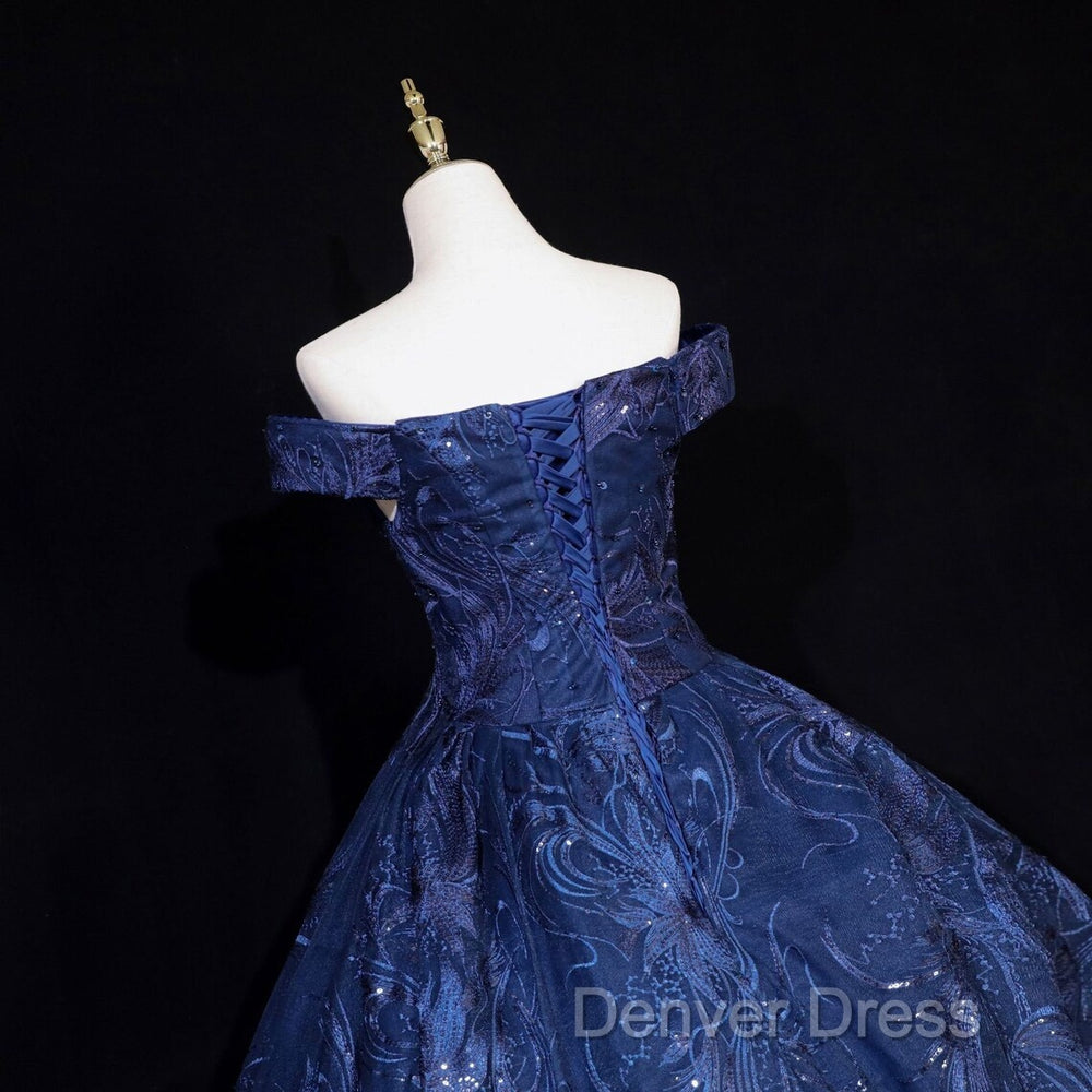 Navy Blue Ball Gown Long Formal Dresses, Off Shoulder Navy Blue Party Dresses