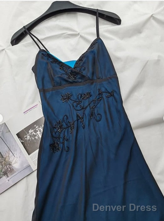 Navy Blue Mermaid Spaghetti Strap Tulle Beading Long Prom Dress V-Neck Graduation Prom Adult Ceremony Dress