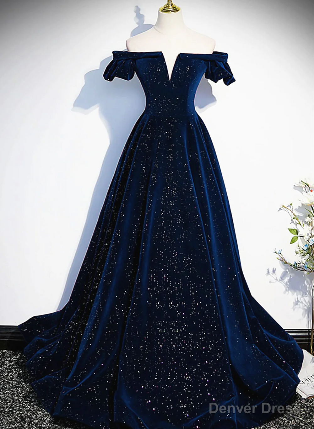 Navy Blue Velvet Off Shoulder Long Party Dress, Navy Blue Prom Dress Formal Dress