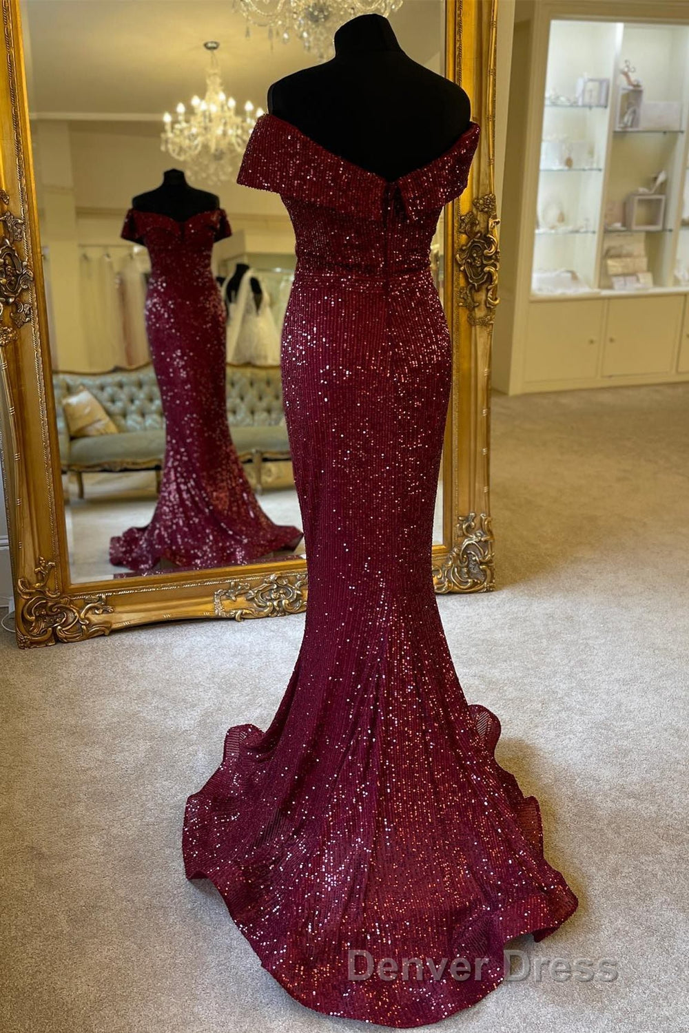 Off the Shoulder Burgundy Sequins Mermaid Long Formal Dresses