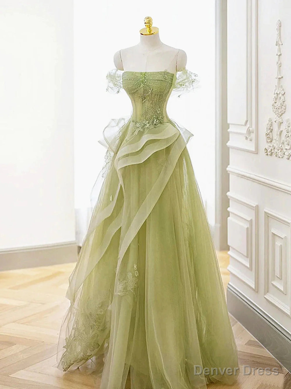 Off the Shoulder Green Tulle Long Beaded Prom Dresses, Off Shoulder Green Tulle Long Formal Evening Dresses