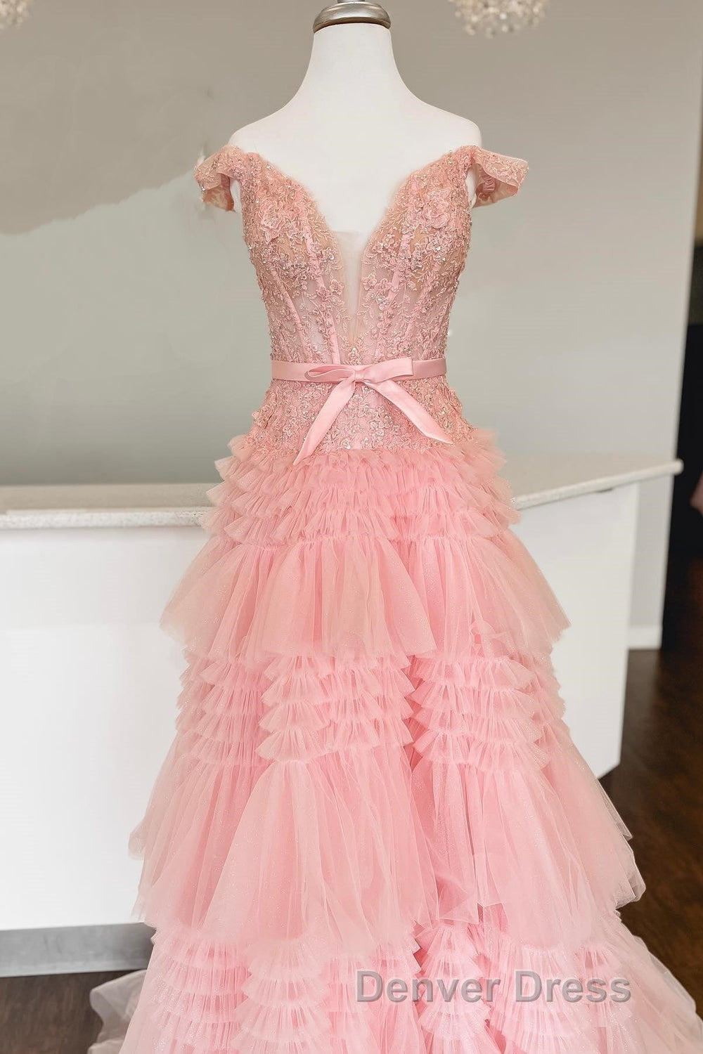 Off the Shoulder Red Appliques Tiered Long Formal Dresses